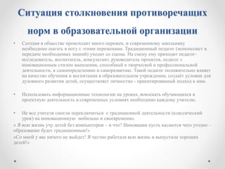 Документ рассматривает изменения в образовательной политике и необходимость перехода от традиционных методов обучения к инновационным подходам. Акцентируется внимание на роли нового типа педагогов, способных внедрять информационные технологии и проектную деятельность в учебный процесс. Также поднимаются проблемы адаптации учителей к этим изменениям и пути их мотивации для вовлечения в инновационную деятельность.