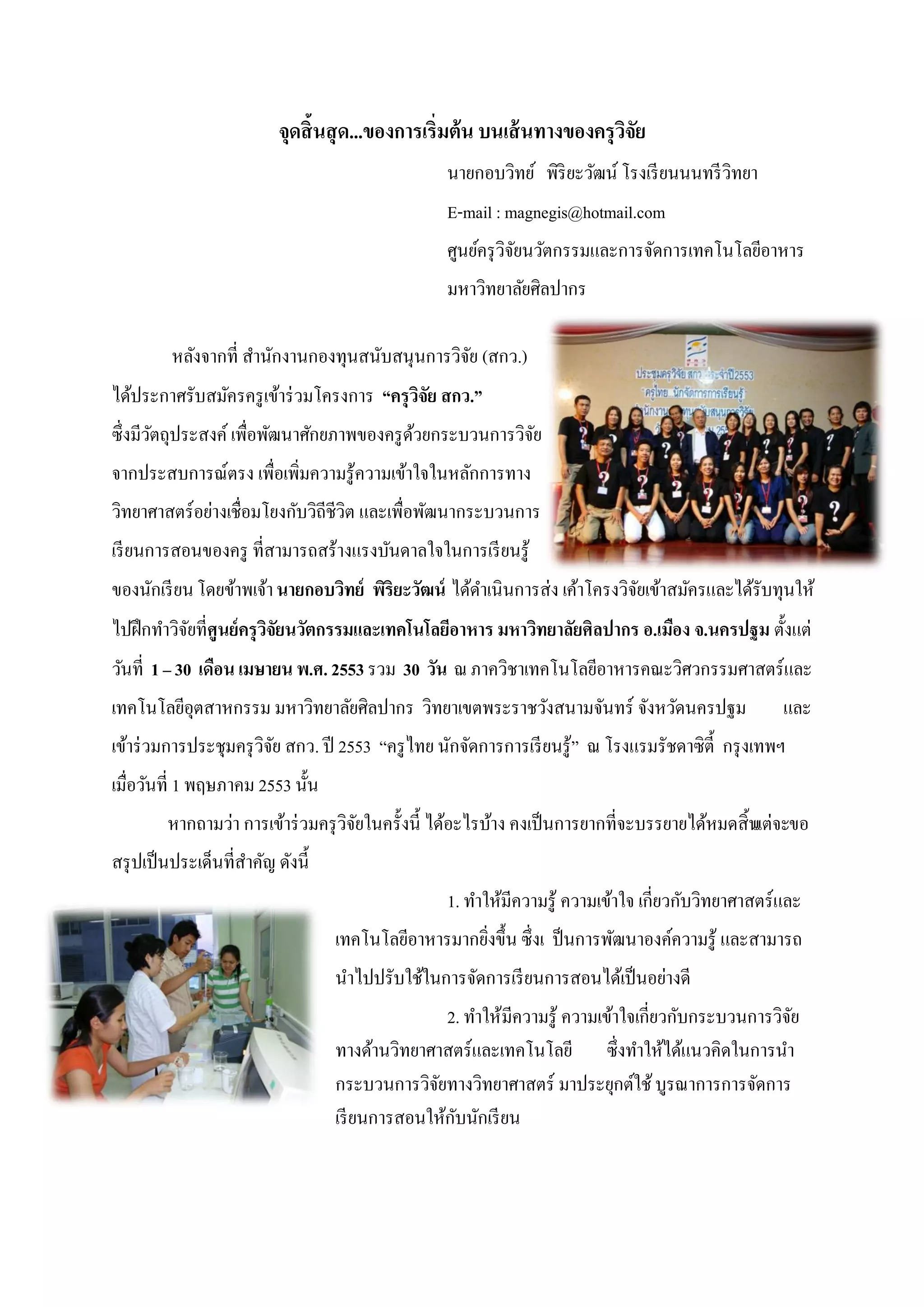 นทางของครุวจย ิั นายกอบวิทย์ พิริยะวัฒน์ โรงเรี ยนนนทรี วิทยา E-mail : magnegis@hotmail.com ศูนย์ครุ วิจยนวัตกรรมและการจัดการเทคโนโลยีอาหาร ั มหาวิทยาลัยศิลปากร หลังจากที่ สานักงานกองทุนสนับสนุนการวิจย (สกว.) ั ได้ประกาศรับสมัครครู เข้าร่ วมโครงการ “ครุวจย สกว.” ิั ซึ่งมีวตถุประสงค์ เพื่อพัฒนาศักยภาพของครู ดวยกระบวนการวิจย ั ้ ั จากประสบการณ์ตรง เพื่อเพิ่มความรู้ความเข้าใจในหลักการทาง วิทยาศาสตร์อย่างเชื่อมโยงกับวิถีชีวิต และเพื่อพัฒนากระบวนการ เรี ยนการสอนของครู ที่สามารถสร้างแรงบันดาลใจในการเรี ยนรู้ ของนักเรี ยน โดยข้าพเจ้า นายกอบวิทย์ พิริยะวัฒน์ ได้ดาเนินการส่ง เค้าโครงวิจยเข้าสมัครและได้รับทุนให้ ั ไปฝึ กทาวิจยที่ศูนย์ครุวจยนวัตกรรมและเทคโนโลยีอาหาร มหาวิทยาลัยศิลปากร อ.เมือง จ.นครปฐม ตั้งแต่ ั ิั วันที่ 1 – 30 เดือน เมษายน พ.ศ. 2553 รวม 30 วัน ณ ภาควิชาเทคโนโลยีอาหารคณะวิศวกรรมศาสตร์และ เทคโนโลยีอุตสาหกรรม มหาวิทยาลัยศิลปากร วิทยาเขตพระราชวังสนามจันทร์ จังหวัดนครปฐม และ เข้าร่ วมการประชุมครุ วิจย สกว. ปี 2553 “ครู ไทย นักจัดการการเรี ยนรู้” ณ โรงแรมรัชดาซิต้ ี กรุ งเทพฯ ั เมื่อวันที่ 1 พฤษภาคม 2553 นั้น หากถามว่า การเข้าร่ วมครุ วิจยในครั้งนี้ ได้อะไรบ้าง คงเป็ นการยากที่จะบรรยายได้หมดสิ้น จะขอ ั แต่ สรุ ปเป็ นประเด็นที่สาคัญ ดังนี้ 1. ทาให้มีความรู้ ความเข้าใจ เกี่ยวกับวิทยาศาสตร์และ เทคโนโลยีอาหารมากยิงขึ้น ซึ่งเ ป็ นการพัฒนาองค์ความรู้ และสามารถ ่ นาไปปรับใช้ในการจัดการเรี ยนการสอนได้เป็ นอย่างดี 2. ทาให้มีความรู้ ความเข้าใจเกี่ยวกับกระบวนการวิจย ั ทางด้านวิทยาศาสตร์และเทคโนโลยี ซึ่งทาให้ได้แนวคิดในการนา กระบวนการวิจยทางวิทยาศาสตร์ มาประยุกต์ใช้ บูรณาการการจัดการ ั เรี ยนการสอนให้กบนักเรี ยน ั