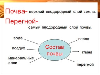 Документ описывает состав и особенности почвы, включая наличие перегноя, песка и глины. Указывается, что чернозёмные почвы, богатые перегноем, способствуют высоким урожаям, в то время как светлые почвы требуют дополнительных удобрений. Также поднимается вопрос о необходимых условиях для роста деревьев.