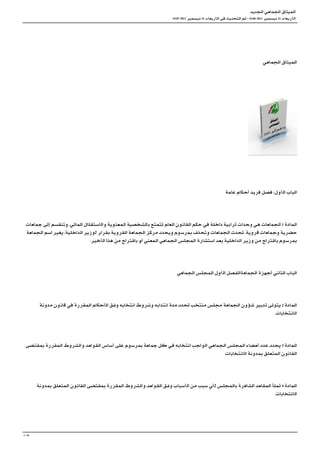 اﻠﺠدﻴﺪاﻠﺠﻤاﻌﻲاﻠﻤﻴﺜاﻖ 19:072011دﻴﺴﻤﺒﺮ21,اﻠأرﺒﻌاءﻓﻰاﻠﺘﺤدﻴﺚﺗﻢ-14:062011دﻴﺴﻤﺒﺮ21,اﻠأرﺒﻌاء اﻠﺠﻤاﻌﻲاﻠﻤﻴﺜاﻖ ﻋاﻤﺔأﺤﻜاﻢﻓرﻴﺪﻓﺼﻞ:اﻠأوﻞاﻠﺒاﺐ ﺟﻤاﻌاﺖإﻠﻰوﺘﻨﻘﺴﻢ.اﻠﻤاﻠﻲواﻠاﺴﺘﻘﻠاﻞاﻠﻤﻌﻨوﻴﺔﺑاﻠﺸﺨﺼﻴﺔﺗﺘﻤﺘﻊاﻠﻌاﻢاﻠﻘاﻨوﻦﺣﻜﻢﻓﻲداﺨﻠﺔﺗراﺒﻴﺔوﺤداﺖﻫﻲاﻠﺠﻤاﻌاﺖ1اﻠﻤادﺔ اﻠﺠﻤاﻌﺔاﺴﻢﻳﻐﻴﺮ.اﻠداﺨﻠﻴﺔﻟوزﻴﺮﺑﻘراﺮاﻠﻘروﻴﺔاﻠﺠﻤاﻌﺔﻣرﻜﺰوﻴﺤدﺪﺑﻤرﺴوﻢوﺘﺤذﻒاﻠﺠﻤاﻌاﺖﺗﺤدﺚ.ﻗروﻴﺔوﺠﻤاﻌاﺖﺣﻀرﻴﺔ .اﻠأﺨﻴﺮﻫذﺎﻣﻦﺑاﻘﺘراﺢأﻮاﻠﻤﻌﻨﻲاﻠﺠﻤاﻌﻲاﻠﻤﺠﻠﺲاﺴﺘﺸارﺔﺑﻌﺪاﻠداﺨﻠﻴﺔوزﻴﺮﻣﻦﺑاﻘﺘراﺢﺑﻤرﺴوﻢ اﻠﺠﻤاﻌﻲاﻠﻤﺠﻠﺲاﻠأوﻞاﻠﺠﻤاﻌةاﻠﻔﺼﻞأﺠﻬزﺔاﻠﺜاﻨﻲاﻠﺒاﺐ ﻣدوﻨﺔﻗاﻨوﻦﻓﻲاﻠﻤﻘررﺔاﻠأﺤﻜاﻢوﻔﻖاﻨﺘﺨاﺒﻪوﺸروﻂاﻨﺘداﺒﻪﻣدﺔﺗﺤدﺪﻣﻨﺘﺨﺐﻣﺠﻠﺲاﻠﺠﻤاﻌﺔﺷؤوﻦﺗدﺒﻴﺮﻳﺘوﻠﻰ2اﻠﻤادﺔ اﻠاﻨﺘﺨاﺒاﺖ ﺑﻤﻘﺘﻀﻰاﻠﻤﻘررﺔواﻠﺸروﻂاﻠﻘواﻌﺪأﺴاﺲﻋﻠﻰﺑﻤرﺴوﻢﺟﻤاﻌﺔﻛﻞﻓﻲاﻨﺘﺨاﺒﻪاﻠواﺠﺐاﻠﺠﻤاﻌﻲاﻠﻤﺠﻠﺲأﻌﻀاءﻋدﺪﻳﺤدﺪ3اﻠﻤادﺔ اﻠاﻨﺘﺨاﺒاﺖﺑﻤدوﻨﺔاﻠﻤﺘﻌﻠﻖاﻠﻘاﻨوﻦ ﺑﻤدوﻨﺔاﻠﻤﺘﻌﻠﻖاﻠﻘاﻨوﻦﺑﻤﻘﺘﻀﻰاﻠﻤﻘررﺔواﻠﺸروﻂاﻠﻘواﻌﺪوﻔﻖاﻠأﺴﺒاﺐﻣﻦﺳﺒﺐﻟأﻲﺑاﻠﻤﺠﻠﺲاﻠﺸاﻐرﺔاﻠﻤﻘاﻌﺪﺗﻤﻠﺄ4اﻠﻤادﺔ اﻠاﻨﺘﺨاﺒاﺖ 1/36