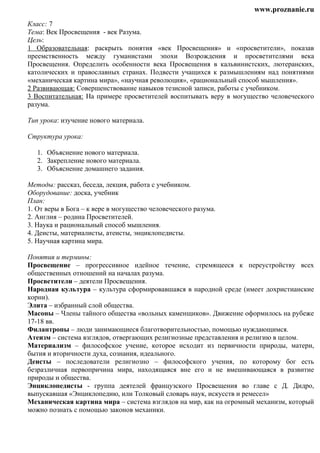 Документ описывает план урока для 7 класса на тему 'век просвещения - век разума', направленный на изучение понятий, связанных с просветительством и его влиянием на культуру и науку. Урок включает объяснение нового материала, закрепление знаний и домашнее задание, а также роль просветителей в различных религиозных контекстах. По итогам урока учащиеся должны развить навыки критического мышления и осмыслить значение научного знания в обществе.