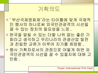 기획의도 ‘부산국제영화제’라는 타이틀에맞게 국제적인 행사의 하나로써 외국인관광객의 시선을 끌 수 있는 장치의 필요성을 느낌. 한국을 알릴 수 있는 더할 나위 없는 좋은 기회라고 생각하고 우리나라의 관광산업 발전과 친밀한 교류가 이루어 지기를 희망함. 행사 기획자로서의 관점으로 어떻게 하면 외국인관광객의 시선을 끌 수 있을지에 대해 고민함.