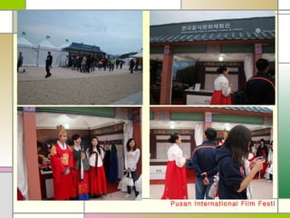 현재상황 국제영화제인 만큼외국인관광객들이 아주 많았다. 외국인관광객들에게 한국을 알릴 수 있는 아주 좋은 기회이며 거기에 발 맞추어 관계자 분들이 ‘한국음식문화체험관’이라는 장치를 만들어 놓았다. 작은 규모에 외국인보다는 한국인이 더 많았고, 심지어 외국인관광객들은 관심 있게 바라보지는 않았다.