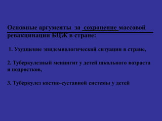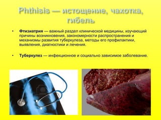 Документ представляет собой презентацию о туберкулезе, подготовленную врачом-пульмонологом, и освещает его диагностику, лечение и профилактику. Рассматриваются исторические аспекты, эпидемиология заболевания, пути передачи возбудителя, а также история вакцинации и необходимость профилактических мер в условиях социальной уязвимости. Обозначены основные факторы, способствующие росту заболеваемости туберкулезом в России, и даны рекомендации по вакцинации и химиопрофилактике.