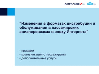 Документ описывает изменения в дистрибуции и обслуживании пассажирских авиаперевозок в эпоху интернета, акцентируя внимание на переходе к электронным билетам и интернет-продажам. Прямые продажи авиабилетов стали более распространенными, благодаря чему изменилась структура дистрибуции в пользу онлайн-каналов. Также затрагиваются вопросы коммуникации с пассажирами и их предпочтений в использовании социальных медиа.