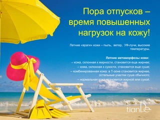 Документ описывает влияние летних условий на здоровье кожи и предлагает советы по уходу за ней. Основное внимание уделено увлажнению, предотвращению старения и применение специальных масок для лица и шеи с активными компонентами, такими как гиалуроновая кислота и коллаген. Приведены подробности о каждой маске и их воздействии на кожу, а также рекомендации по их использованию.