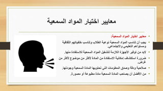 يتناول الوثيقة معايير اختيار المواد السمعية، بما في ذلك ملاءمتها للخلفيات الثقافية والاجتماعية للطلاب ومستوى تعليمهم. كما يشمل دليلًا لاختيار الصور والرسوم البيانية ومقاييس الفيديو، مع التركيز على الدقة والجودة ووضوح المعلومات. تُبرز المعايير أهمية استخدام مصادر موثوقة والتأكد من توافق المحتوى مع الأهداف التعليمية.