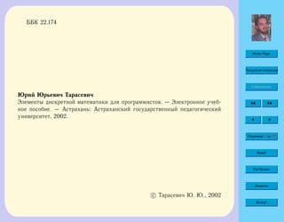 Документ представляет собой электронное учебное пособие по элементам дискретной математики, написанное Ю. Ю. Тарасевичем и изданное в 2002 году. Он охватывает ключевые темы, такие как теория графов, комбинаторика и алгоритмы, включающие основные определения и задачи для программирования. Учебное пособие также содержит контрольные работы и примеры применения математических концепций.