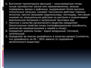 Документ анализирует характеристики и показатели плодородия почвы, в частности в Иркутской области, рассматривая естественные и искусственные факторы, влияющие на качество почвы. Также описываются необходимые макро- и микроэлементы для нормального роста растений, их влияние на сельскохозяйственные культуры и признаки дефицита этих веществ. В заключение представлены типы почв региона и их площадь, а также важность кислотности почвы для доступности питательных веществ.