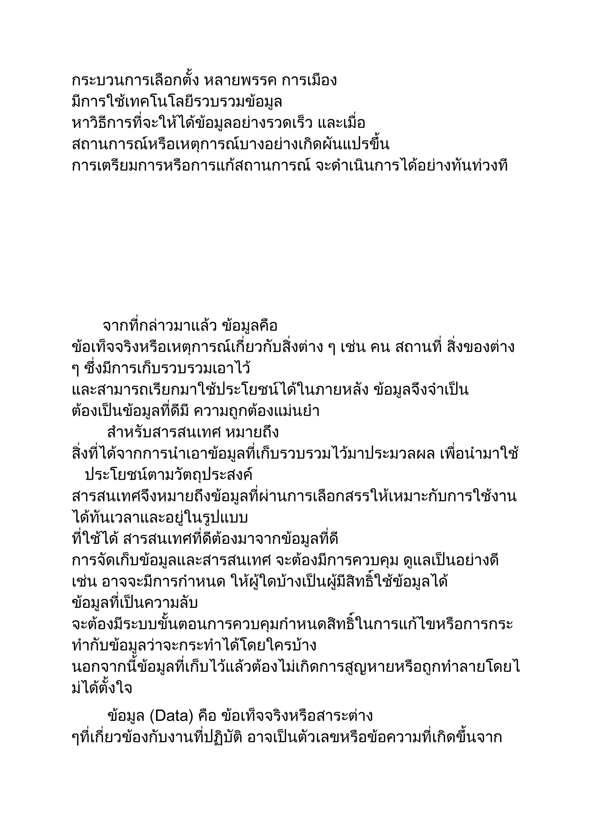 ข้อมูล (Data) หมายถึงข่าวสาร เอกสาร ข้อเท็จจริงเกี่ยวกับบุคคล สิ่งของหรือเหตุการณ์ในรูปแบบของตัวเลข ภาพ ตัวอักษร และสัญลักษณ์ต่างๆ เช่นคะแนนสอบวิชาภาษาไทย ราคาสินค้า จำนวนนักเรียนในโรงเรียน สารสนเทศ (Information) หมายถึง ข้อมูลต่างๆ ที่ได้ผ่านการเปลี่ยนแปลงหรือมีการประมวลผลหรือวิเคราะห์สรุปผลด้วยวิธีการต่าง ๆแล้วเก็บรวบรวมไว้ เพื่อนำมาใช้ประโยชน์ตามต้องการการประมวล (Data Processing)เป็นการนำข้อมูลจากแหล่งต่างๆที่เก็บรวบรวมไว้มาผ่านกระบวนการต่างๆเพื่อแปรสภาพข้อมูลให้เป็นระบบและอยู่ในรูปแบบที่ต้องการ <br />ข้อมูลและสารสนเทศ<br />ในปัจจุบันการแข่งขันทางธุรกิจต้องอาศัยข้อมูลเป็นหลักจึงมีการนำเอาเทคโนโลยีมาช่วยจัดการข้อมูลอย่างมาก ดังจะเห็นได้จากการแข่งขันการให้บริการของธนาคารพาณิชย์การใช้ข้อมูลในการตัดสินใจประกอบการตัดสินใจลงทุนซื้อขาย หลักทรัพย์ ข้อมูลเป็นหัวใจของการดำเนินงานเป็นแหล่งความรู้ที่ใช้ประกอบการตัดสินใจ บริษัทหรือองค์การ จึงดำเนินการ อย่างจริงจังให้ได้มาซึ่งข้อมูล และปกป้องดูแลข้อมูลของตนเป็นอย่างดี เพราะข้อมูลเป็นสิ่งมีค่ามีราคา การโจรกรรม ข้อมูลโดยใช้เทคโนโลยีใหม่ ๆจึงเป็นปัญหาสำคัญที่เกิดขึ้น ดังที่ปรากฏเป็นข่าวทั้งในประเทศและต่างประเทศ <br /> ข้อมูล (DATA) คือ ข้อเท็จจริง หรือเหตุการณ์ที่เกี่ยวข้องกับสิ่งต่าง ๆ เช่น คน สัตว์ สิ่งของ สถานที่ ฯลฯ ข้อมูล จึงเป็นเรื่องที่เกี่ยวกับเหตุการณ์ของสิ่งต่าง ๆ ที่เกิดขึ้นอย่างต่อเนื่อง มีการ รวบรวม ข้อมูลอย่างเป็นระบบ และต่อเนื่อง ดังจะเห็นจาก กระบวนการเลือกตั้ง หลายพรรค การเมือง มีการใช้เทคโนโลยีรวบรวมข้อมูล หาวิธีการที่จะให้ได้ข้อมูลอย่างรวดเร็ว และเมื่อ สถานการณ์หรือเหตุการณ์บางอย่างเกิดผันแปรขึ้น การเตรียมการหรือการแก้สถานการณ์ จะดำเนินการได้อย่างทันท่วงที <br /> <br /> จากที่กล่าวมาแล้ว ข้อมูลคือ ข้อเท็จจริงหรือเหตุการณ์เกี่ยวกับสิ่งต่าง ๆ เช่น คน สถานที่ สิ่งของต่าง ๆ ซึ่งมีการเก็บรวบรวมเอาไว้ และสามารถเรียกมาใช้ประโยชน์ได้ในภายหลัง ข้อมูลจึงจำเป็น ต้องเป็นข้อมูลที่ดีมี ความถูกต้องแม่นยำ<br /> สำหรับสารสนเทศ หมายถึง สิ่งที่ได้จากการนำเอาข้อมูลที่เก็บรวบรวมไว้มาประมวลผล เพื่อนำมาใช้ <br /> ประโยชน์ตามวัตถุประสงค์ สารสนเทศจึงหมายถึงข้อมูลที่ผ่านการเลือกสรรให้เหมาะกับการใช้งานได้ทันเวลาและอยู่ในรูปแบบ<br />ที่ใช้ได้ สารสนเทศที่ดีต้องมาจากข้อมูลที่ดี การจัดเก็บข้อมูลและสารสนเทศ จะต้องมีการควบคุม ดูแลเป็นอย่างดี เช่น อาจจะมีการกำหนด ใ