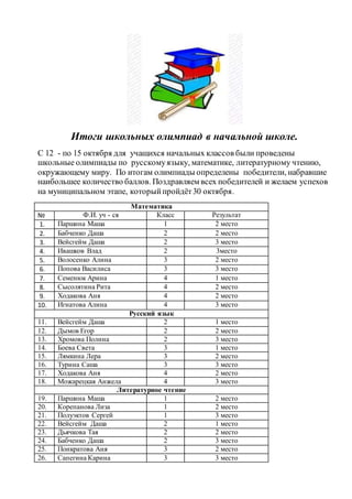 С 12 по 15 октября в начальной школе прошли олимпиады по русскому языку, математике, литературному чтению и окружающему миру. Определены победители, которые получили высокие баллы, и поблагодарены все участники. Муниципальный этап олимпиады состоится 30 октября.