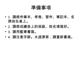 準備事項 • 1. 請將作業本、考卷、習作、筆記本、名 牌放在桌上。 •