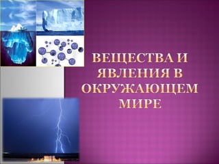 Документ описывает три агрегатные состояния веществ: жидкое, твёрдое и газообразное, а также молекулярную структуру веществ. Он выделяет физические и химические явления, акцентируя внимание на разнице между изменением состояния вещества и химической реакцией, которая приводит к образованию новых веществ. Примеры физических и химических явлений также приводятся для иллюстрации различных процессов.