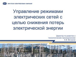 Документ описывает управление режимами электрических сетей для снижения потерь электроэнергии и включает анализ тарифов, влияющих на финансовые потоки и потери. Основное внимание уделяется стейкхолдерам компании, динамике тарифов и путям оптимизации энергосбережения через управление реактивной мощностью. Также рассматриваются проблемы, связанные с повышением эффективности и необходимостью разработки новых методик для учета интересов всех участников энергетического рынка.