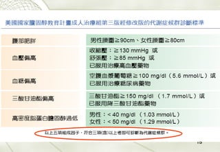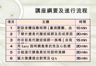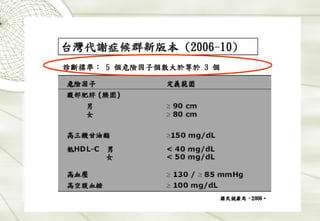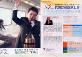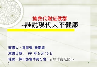 该文档介绍了袁毓瑩营养师于2008年关于代谢症候群的演讲,阐述了代谢症候群的定义、成因及影响,强调健康饮食和运动的重要性,并提供了具体的饮食和运动对策。演讲中还提及了代谢症候群在现代社会中的普遍性,以及相关疾病的风险和预防措施。袁毓瑩的丰富背景和经验为这一主题提供了专业的视角。