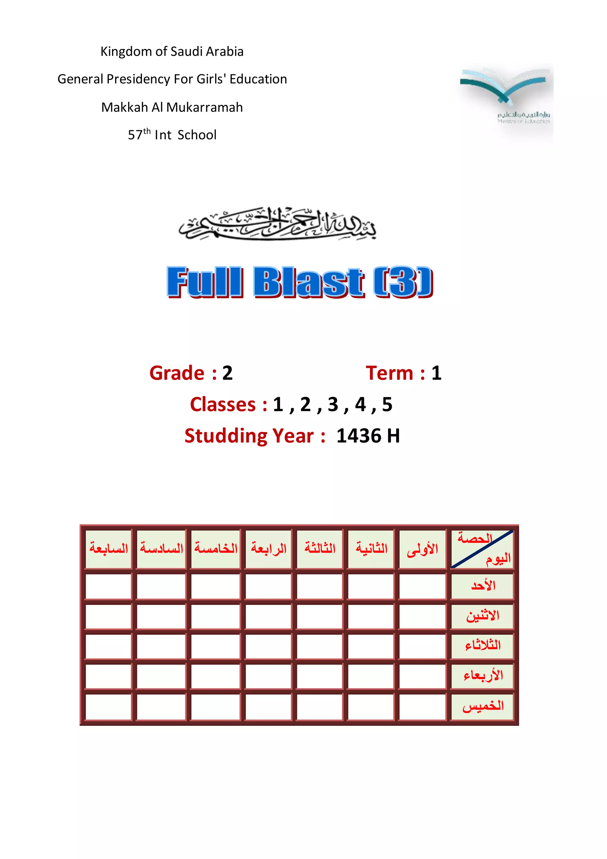 The document contains a schedule for classes 1-5 of grade 2 for the first term of the 1436 Hijri year. It includes the days of the week and lists the weekly classes for each subject. The schedule also notes the school name, location in Makkah Al Mukarramah, and affiliation with the General Presidency For Girls' Education of the Kingdom of Saudi Arabia.