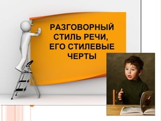 Документ рассматривает разговорный стиль речи как одну из разновидностей литературного языка, характеризующуюся непринужденностью и экспрессивностью. Описываются его стилистические черты, функции, особенности лексики, синтаксиса и звуковой стороны, а также контекст применения в различных сферах общения. Приведены примеры и ситуации для иллюстрации правил поведения и вежливости в обществе.