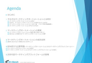 SCRATCH Co.Ltd. Agenda 1. そもそもマーケティングオートメーションとは何か (1) マーケティングオートメーションとは何か (2) なぜ今、マーケティングオートメーションが求められているのか (3) マーケティングオートメーションツールの一覧 ~タイプ別の特徴整理~ (4) マーケティングオートメーションがもたらすもの 2. マーケティングオートメーションの真実 (1) マーケティングオートメーションの導入前に知るべきこと (2) 知らないと失敗する“マーケティングオートメーションの罠” 3.マーケティングオートメーションの成功法則 (1) 絶対におさえるべき導入の3つのポイント 4.2016年からの新常識~マーケティングオートメーションからマーケティングプラットフォームへ~ (1) マーケティングプラットフォームとは何か (2) マーケティングオートメーションからマーケティングプラットフォームへの流れ 5.次世代型マーケティングプラットフォームの登場 0. はじめに 2
