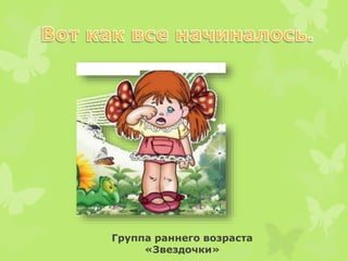 Документ описывает группу детей раннего возраста «звездочки», их адаптацию к детскому саду и повседневные Aktivitäten. Сначала дети испытывали скуку и тоску по родителям, но вскоре начали играть, танцевать и весело проводить время. В конце выражается благодарность за внимание.
