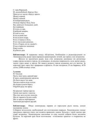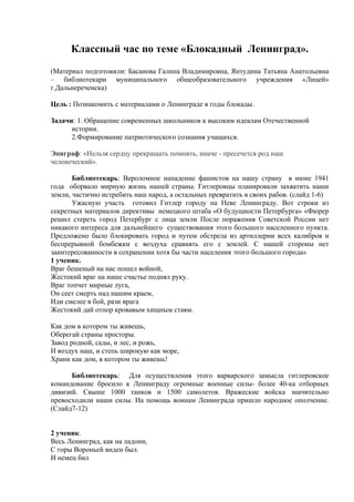Документ представляет собой материал для классного часа на тему блокады Ленинграда, цель которого - познакомить школьников с историей и трагедиями этого периода. В нем изложены ужасные факты о жестоких лишениях, голоде и героизме ленинградцев, включая личную историю Тани Савичевой, чьи записи стали символом страданий и борьбы города. Также документ подчеркивает важность формирования патриотического сознания у молодежи.