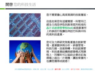 您不需要擔心高深莫測的技術層面。 但是如果您有這樣需要,科管所已 經全力為您爭取到教育部所核准的 晶片系統商管學程(SoC)或是跟著所 上的參訪行程讓你拜訪竹科與中科 的高科技產業。 您可全力將研究焦點著重在創新管 理、產業競爭與分析、研發管理、 科技行銷、技術移轉、科技創業管 理、科技產業結構與經營模式等課 程上,同樣的可以協助企業在紅海 商場上殺出一片商機,讓股東獲利, 也讓您獲得成就感! 同年度獲得SoC學程學校有:清華大學、成功大學、中山大學、逢甲大學、淡江大學等。逢甲是中部唯一獲得該學程的學校。
