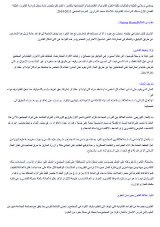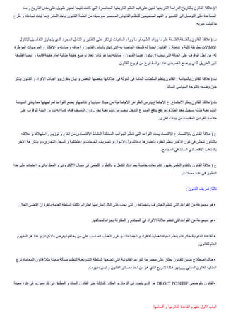 تناقش الوثيقة مفهوم القانون وأهميته في تنظيم العلاقات الاجتماعية والسياسية والاقتصادية، حيث يُعتبر القانون أداة لتحقيق العدالة والتوازن بين حقوق الأفراد ومصالح المجتمع. تسلط الوثيقة الضوء على العلاقة بين القانون وفلسفة العدالة، مع التركيز على الدور الذي يلعبه القانون في تنظيم سلوك الأفراد والعلاقات بينهم. كما تستعرض الوثيقة أيضًا تطور القانون وأثره على المجتمع وكيفية تسخير القوانين لتحقيق التنمية والسلام.