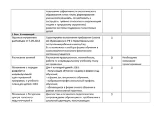 Документ представляет собой диагностическую карту, в которой анализируется нормативное пространство ГБОУ Школы №2083 для реализации проекта по разработке экологического подхода в инклюзивном образовании. В ходе исследования выявлены недостатки, такие как отсутствие упоминания инклюзивных форм обучения и необходимость корректировки документов для учета экопедагогики. Также освещены правила внутреннего распорядка и порядок промежуточной аттестации обучающихся, где выявлены проблемы в учете детей с особыми образовательными потребностями.