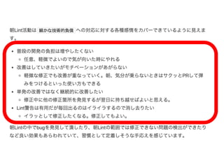 ・朝の達成感が最高!!! ・挑戦しやすいコードになる ・機能追加や修正に集中できる ・健康に良い気がする