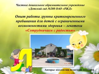 Документ описывает работу частного дошкольного образовательного учреждения 'детский сад no208 оао «ржд»', специализирующегося на психолого-педагогическом сопровождении детей с ограниченными возможностями здоровья. Основные цели программы включают социализацию и развитие личности детей, а также поддержку родителей в воспитательном процессе. Программа включает гибкие методы работы, индивидуальные коррекционно-развивающие маршруты и взаимодействие с семьей для достижения индивидуальных результатов.