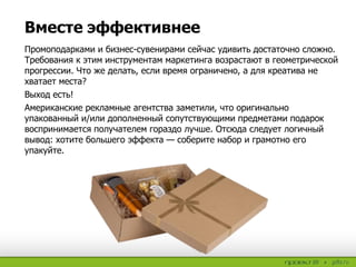 Документ описывает важность создания эффективных наборов подарков и бизнес-сувениров для маркетинга. Основное внимание уделяется выбору целевой аудитории, идеям и упаковке наборов, чтобы повысить их привлекательность. Приведены примеры различных наборов с ценами и составом.