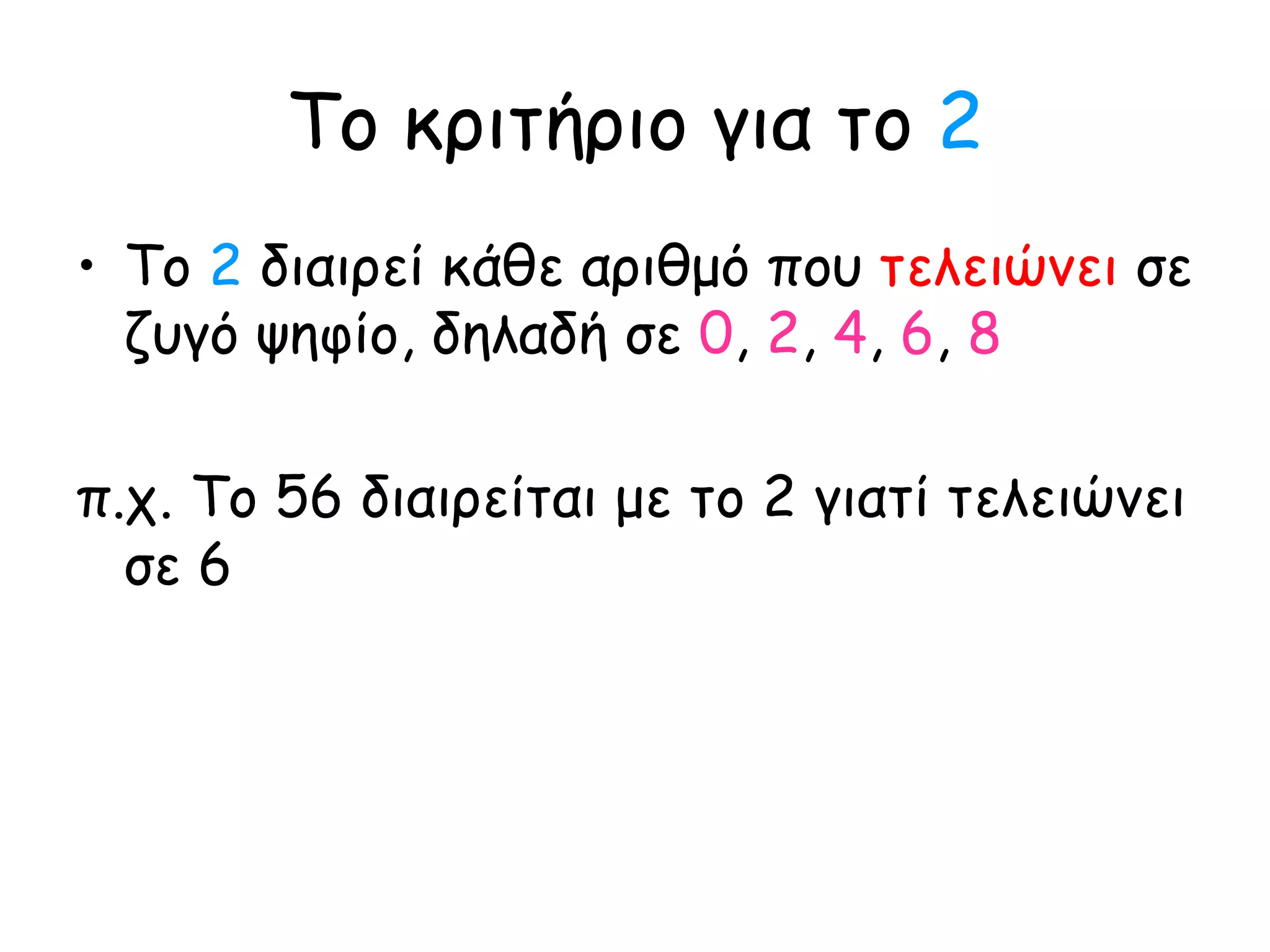 Το κριτήριο γιατο 2 Το 2 διαιρεί κάθε αριθμό που τελειώνει σε ζυγό ψηφίο, δηλαδή σε 0 , 2 , 4 , 6 , 8 π.χ. Το 56 διαιρείται με το 2 γιατί τελειώνει σε 6