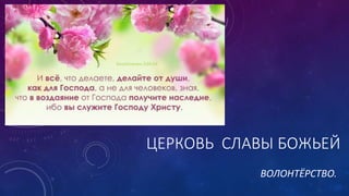 Церковь Славы Божьей активно участвует в волонтёрских проектах, включая акцию 'Собери подарок сироте', где были собраны рождественские подарки для детей. В рамках сотрудничества с благотворительным фондом 'От сердца' волонтеры принесли радость и любовь Христову в семьи. Также осуществляется служение в военном госпитале.