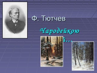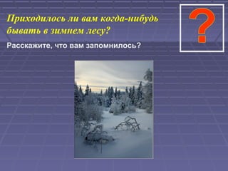 Документ представляет собой размышления о зимнем лесу, описываемом в поэзии Ф. Тютчева, где лес изображается как околдованная чародейкой зима. Автор приглашает читателя задуматься о красоте зимних пейзажей и различиях в восприятии природы между равнодушными и любознательными людьми. В тексте также подчеркивается волшебство зимы и приглашение представить себе образы зимы-колдуньи.
