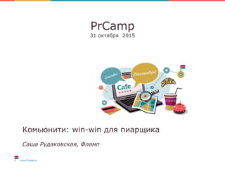 Документ обсуждает создание комьюнити вокруг бренда, выделяя важность общих ценностей и общения среди пользователей. Он подчеркивает преимущества для пиарщиков, желающих построить комьюнити без затрат на рекламу, а также упоминает статистику флампа, включая количество отзывов и посетителей. Также рассматривается целевая аудитория, которая может извлечь выгоду из построения сообщества.