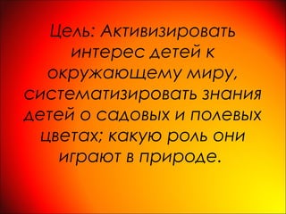 Документ описывает совместную деятельность взрослого и ребенка, нацеленную на развитие познавательных способностей и интереса к окружающему миру через изучение садовых и полевых цветов. Упоминаются различные виды цветов и их особенности, что служит целью систематизировать знания детей о природе. Основное внимание уделяется первоцветам и их роли в экосистеме.