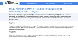 Документ описывает рекламную кампанию программы «ла страда», направленную на содействие безопасной миграции, организованную агентством «номинал технология». Благодаря использованию медийной рекламы и автоматизированной системе programmatic buying, удалось повысить трафик сайта на 128% и привлечь внимание крупных СМИ. В рамках кампании была проведена оценка сайта, сегментация целевой аудитории и внедрение рекламы для различных устройств.