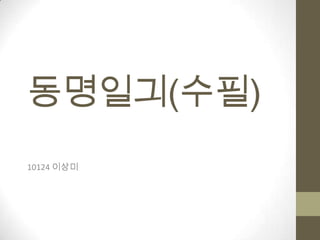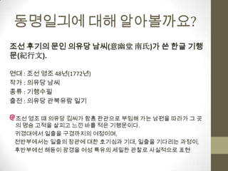 동명일긔에 대해 알아볼까요?조선후기의 문인 의유당 남씨(意幽堂 南氏)가 쓴 한글 기행문(紀行文).연대 : 조선 영조 48년(1772년)작가 : 의유당 남씨종류 : 기행수필출전 : 의유당관북유람일기조선 영조 떄의유당 김씨가 함흥 판관으로 부임해 가는 남편을 따라가 그 곳의 명승 고적을 살피고 느낀 바를 적은 기행문이다. 귀경대에서일출을 구경까지의 여정이며, 전반부에서는 일출의 장관에 대한 호기심과 기대, 일출을 기다리는 과정이,후반부에선해돋이 광경을 여성 특유의 세밀한 관찰로 사실적으로 표현