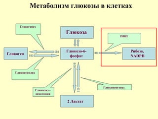 Документ содержит лекцию о пентозо-фосфатном пути и его роли в метаболизме глюкозы, включая синтез NADPH и рибозы для биосинтеза. Описаны основные этапы и ферменты пентозо-фосфатного цикла, а также примеры локализации процесса в различных тканях организма. Рассматриваются регуляторные механизмы активности ферментов и влияние дефицита глюкозо-6-фосфатдегидрогеназы на здоровье.