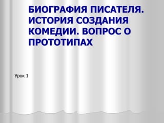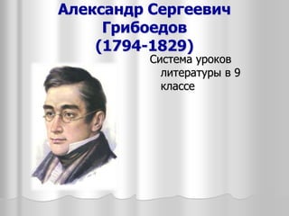 Документ посвящен Александру Сергеевичу Грибоедову, его биографии и истории создания комедии 'Горе от ума'. Излагаются важные факты о жизни писателя, его произведениях и прототипах персонажей комедии, а также особенности литературного направления, которому принадлежит это произведение. В документе также рассматриваются различные типы героев в комедии и их влияние на развитие сюжета.