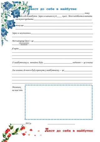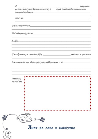 лист до себе в майбутнє.Зараз я навчаюся у 6____ класі. Мені подобається