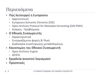 Ο ΕθνικόςΣυσσωρευτήςΗ ΤΕΧΝΙΚΗΥΠΟΔΟΜΗ ΤΟΥ ΕΘΝΙΚΟΥ ΣΥΣΣΩΡΕΥΤΗ9Αποτελεί ένα κεντρικό σημείο επικοινωνίας μεταξύ των εθνικών ψηφιακών βιβλιοθηκών και της Europeana.Ο ρόλος του εθνικού συσσωρευτή σε τεχνικό επίπεδο είναι πολυδιάστατος:Καθοδηγεί τις ψηφιακές βιβλιοθήκες για τις τεχνικές προδιαγραφές που πρέπει να ακολουθούνΣυλλέγει δεδομένα από τις ψηφιακές βιβλιοθήκεςΕλέγχει την αρτιότητα τους και προτείνει λύσεις σε τυχόν προβλήματαΚωδικοποιεί τα δεδομένα σύμφωνα με τα πρότυπα της EuropeanaΜεταδίδει τα δεδομένα στην Europeana