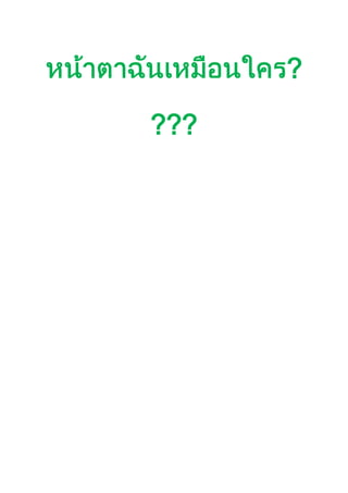 หน้าตาฉันเหมือนใคร????<br />1.ผมหน้าตาเหมือน พ่อ<br/> <br />พ่อตัวผม<br />1.1)จมูกโด่ง 1.2)ตาสองชั้น<br />1.3)คิ้ว 1.4)เล็บ<br />1.5)ติ่งหู 1.6)ห่อลิ้นไม่ได้<br />2.ผมหน้าตาเหมือนแม่<br /> <br />แม่ตัวผม<br />2.1)ริมฝีปาก 2.2)ความสูง<br />2.3)สีผม 2.4)สีผิว<br />2.5)กรุ๊ปเลือด<br />ด.ช.กรกช เปลี่ยนม่วง ม.1/4 เลขที่ 2<br />