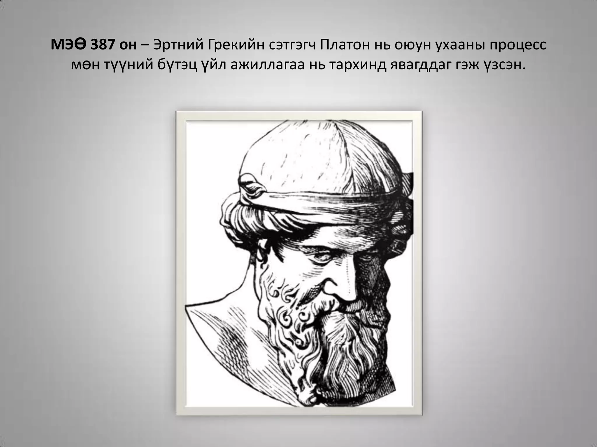 МЭӨ 387 он– Эртний Грекийн сэтгэгч Платон нь оюун ухааны процесс мөн түүний бүтэц үйл ажиллагаа нь тархинд явагддаг гэж үзсэн. - 3.