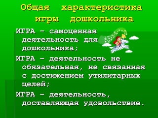 Документ рассматривает важность игры как средства социализации и развития дошкольников, подчеркивая её роль в педагогическом процессе и формировании личностных навыков. Игра не только развивает творческие способности и социальные умения, но и служит основным способом взаимодействия и обучения среди детей. Также рассматриваются основные концепции и классификации игр, а также принципы и этапы организации сюжетно-ролевой игры.