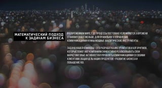 Компания nt.digital разрабатывает инструменты и алгоритмы для эффективного управления маркетинговыми активностями и коммуникациями с клиентами. Среди направлений деятельности компании - IT-консалтинг, programmatic реклама и управление большими данными. Основной целью является развитие бизнеса клиентов и повышение их ROI.