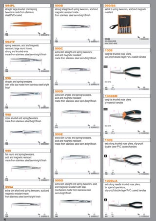 The document contains product codes, measurements, and descriptions for various types of tweezers, pliers, and crimping tools made of stainless steel. It lists over 30 different tools including spring tweezers, needle nose pliers, circlip pliers, and self-locking pliers that vary in size, shape, and specialized features like acid resistance or joint type. The tools are industrial and mechanical tools for tasks like assembly, installation, and metal work.