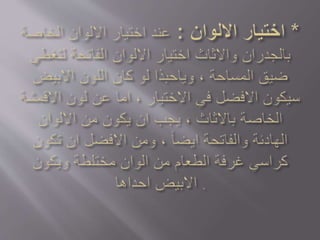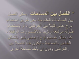 تتناول الوثيقة استغلال المساحات الرأسية في التصميم الداخلي وتحسين الإضاءة واللون لجعل الأماكن تبدو أكبر. توصي باستخدام الألوان الفاتحة والمرايا لزيادة شعور الاتساع، كما تشجع على إزالة الأبواب لفصل المساحات. تشمل النصائح اختيار الأثاث المفتوح وتوفير إضاءة طبيعية لتعزيز الأجواء.