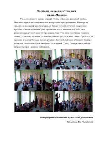 Утренник группы «малинки» под названием «осенняя сказка» прошел 28 октября, где малыши впервые выступали перед родителями. Праздник начался с танца осенних листочков, после чего дети развеселили дождливую тучку песенкой, и она подарила им дождинки для танца. Золотая осень и ее друзья также присутствовали на празднике, оставив детям подарки в виде яблок.