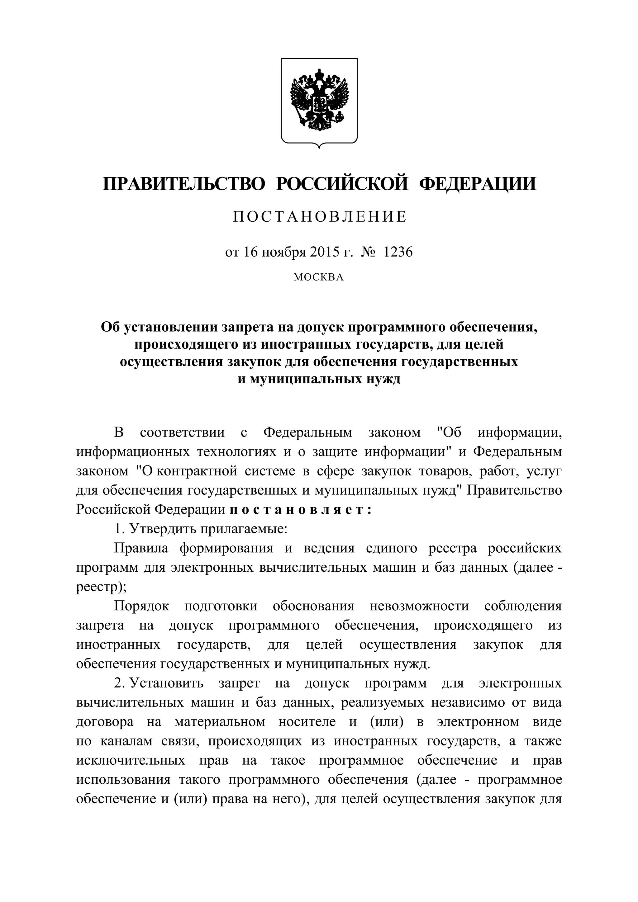 Постановление правительства Российской Федерации от 16 ноября 2015 года вводит запрет на использование иностранного программного обеспечения для государственных закупок, за исключением случаев отсутствия аналогов в реестре или несоответствия установленным требованиям. Установлены правила формирования единого реестра российских программ и условий их включения, а также определены полномочия Министерства связи и массовых коммуникаций как ответственного органа. Постановление вступает в силу с момента публикации, за исключением некоторых пунктов, которые начнут действовать с 1 января 2016 года.
