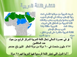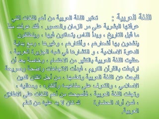 تتناول الوثيقة أصل العرب وتاريخ اللغة العربية، وتبرز أهمية اللغة لأسباب دينية وثقافية. كما تناقش المخاطر التي تواجهها اللغة العربية مثل الإهمال والاعتماد على اللغات الأجنبية، مما يستدعي الحاجة إلى حمايتها وتعليمها للأجيال القادمة. يمكن تحقيق ذلك من خلال برامج تعليمية وندوات لتعزيز استخدام اللغة العربية الفصحى.